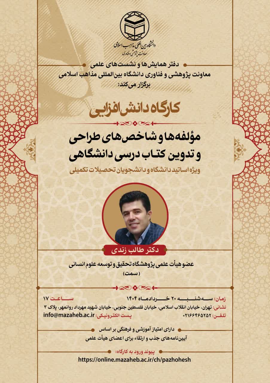 دفتر همایشها و نشستهای علمی معاونت پژوهشی و فناوری دانشگاه بینالمللی مذاهب اسلامی برگزار میکند:
