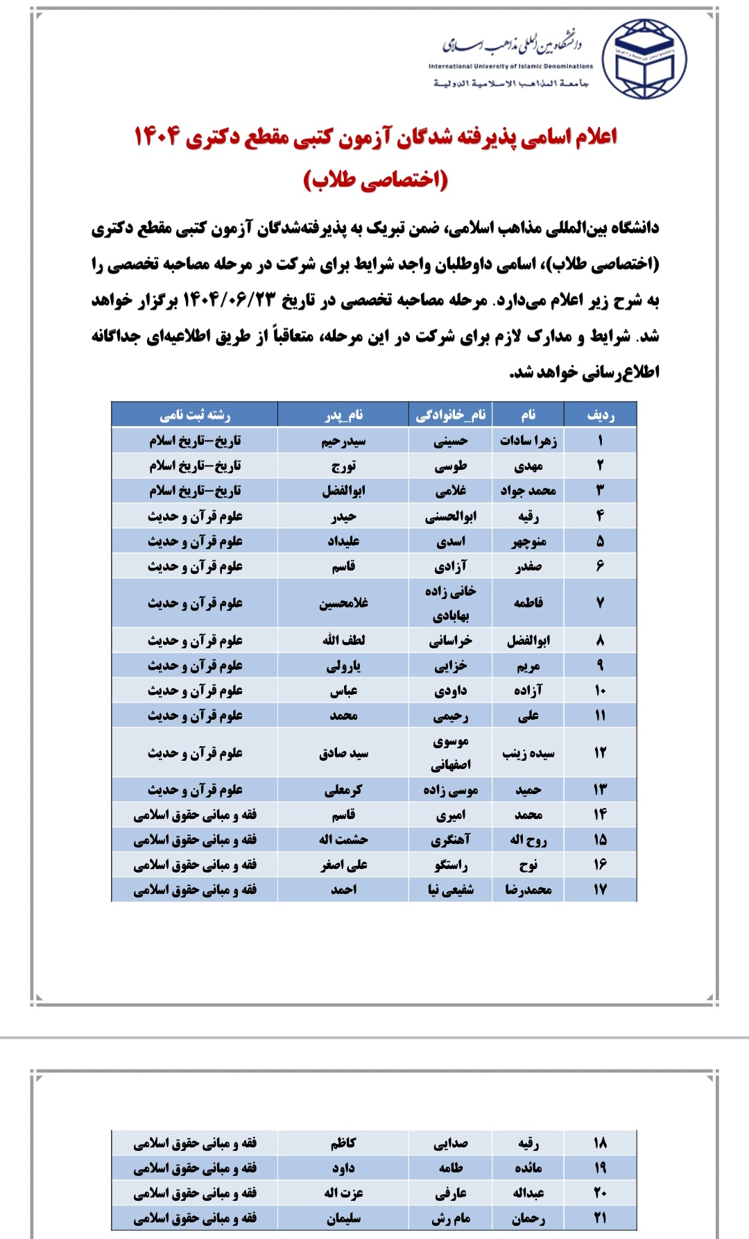 دانشگاه بین المللی مذاهب اسلامی ضمن تبریک به پذیرفته‌شدگان آزمون کتبی مقطع دکتری(اختصاصی طلاب) اسامی داوطلبان واجد شرایط برای شرکت در مرحله تخصصی را به شرح ذیل اعلام می دارد.