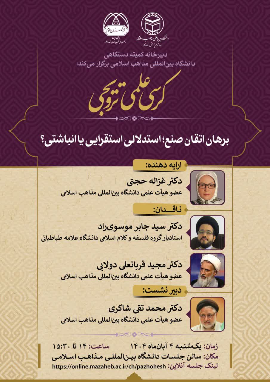 دبیرخانه کمیته دستگاهی دانشگاه بین‌المللی مذاهب اسلامی برگزار می‌کند: کرسی علمی ترویجی با عنوان: برهان اتقان صنع؛ استدلالی استقرائی یا انباشتی؟